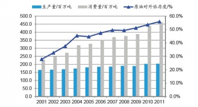 隨著國內居民收入的增長和城鎮(zhèn)化進程的推進,對下游化工產品的需求逐年增加,從而拉動對原油的需求。另外,國內汽車保有量不斷上升(2011年全國汽車保有量為1.06億輛),拉動成品油的需求。中企顧問網發(fā)布的《2012-2016年中國石油產業(yè)深度調研與發(fā)展趨勢研究報告》顯示:我國原油進口依賴度節(jié)節(jié)攀升,已成為全球主要的原油消費國和進口國。中企顧問網統(tǒng)計發(fā)現(xiàn),2011年我國石油對外依存度達到了歷史新高56%。