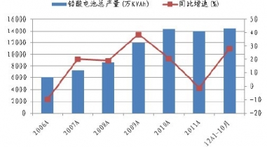 2006年-2012年10月我國鉛酸電池產(chǎn)量及增速