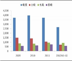 2012年1-10月,全國電源基本建設(shè)完成額為2676億元,同比下降3.0%。電源整體投資自2010年達到近4000億的規(guī)模后,近兩年均出現(xiàn)一定程度的下滑;同時,伴隨著國內(nèi)經(jīng)濟結(jié)構(gòu)和能源結(jié)構(gòu)的調(diào)整,電源投資逐漸向清潔能源傾斜,火電投資連年下滑,水電、核電等清潔能源投資穩(wěn)步增長。