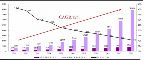 中企顧問網(wǎng)發(fā)布的《2012-2016年中國百貨店市場深度調(diào)查與未來前景研究報告》內(nèi)容顯示:中國百貨行業(yè)收入規(guī)模從2001年的2880億元增長至2011年的8600億元,CAGR為12%;但百貨行業(yè)的市場份額卻逐年下降,占限額以上零售總額的比重從2001年的42%下滑至2011年的11%。