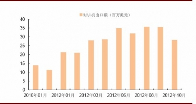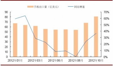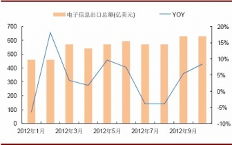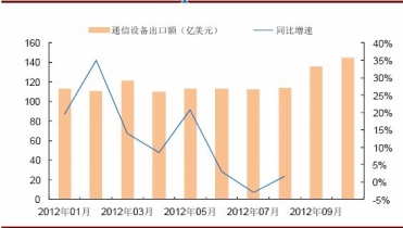 2012 年全球宏觀經(jīng)濟情況不佳,尤其是歐美經(jīng)濟表現(xiàn)較差。但從四季度來看,經(jīng)濟情況已經(jīng)出現(xiàn)了好轉(zhuǎn)的苗頭,表現(xiàn)在通信設(shè)備行業(yè),則是出口情況的好轉(zhuǎn)。工信部數(shù)據(jù)顯示,1-10 月,我國電子信息產(chǎn)品出口總額5597 億美元,同比增長3.9%。其中10 月同比增長8.4%,比上個月提高3 個百分點,出現(xiàn)企穩(wěn)回升的勢頭。從主要行業(yè)來看,出口增速差別較大。1-10 月,在整機類行業(yè)中,通信設(shè)備行業(yè)出口增長最快,出口額1158億美元,增長12.9%,較1-9 月回升1.3 個百分點。