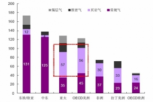 中企顧問網(wǎng)統(tǒng)計數(shù)據(jù)顯示:截至2011年底,全球天然氣技術可開采儲量達到750萬億立方米,其中非常規(guī)氣(包括頁巖氣、致密氣和煤層氣)占到330萬億立方米。北美和亞太地區(qū)的非常規(guī)氣儲量超過了常規(guī)氣儲量,其中頁巖氣的技術可開采儲量分別為56萬億立方米和57萬億立方米,開發(fā)潛力巨大。