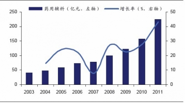2003-2011年中國(guó)藥用輔料規(guī)模及增速統(tǒng)計(jì)