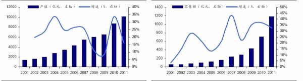 本文導(dǎo)讀:借助“十一五”規(guī)劃的推動(dòng),中國家具行業(yè)經(jīng)歷了高速增長的時(shí)期,2001-2011年家具生產(chǎn)總值復(fù)合增長率為22%,2001-2011年限額以上家具企業(yè)商品零售額復(fù)合增長率達(dá)36%。根據(jù)“十二五”規(guī)劃,我國家具產(chǎn)值和家具產(chǎn)量仍將保持每年15%左右的增長速度。