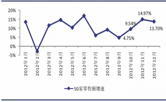 自12年11月、12月以來,50家和百家重點大型零售零售額均實現(xiàn)較好的增長,一改前期的頹勢,終端消費回暖明顯。即使去年同期春節(jié)高基數(shù)導(dǎo)致13年1月份的零售數(shù)據(jù)不是很亮麗,將1-2月份拉平來看,傳統(tǒng)零售的銷售增速仍能實現(xiàn)雙位數(shù)增長;13年上半年,整個行業(yè)將受益于12年銷售逐季下滑的低基數(shù)因素,銷售增速有望持續(xù)回升;13年下半年,零售將受益于經(jīng)濟回升帶動的真實消費增長,全年實現(xiàn)10%-15%的增長指日可待,或有超出預(yù)期的可能。