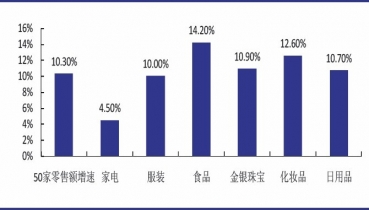 12月全國50家重點大型零售企業(yè)商品零售額增速為13.7%,較11月14.97%的增速略有放緩,主要是受上年同期基數(shù)較高的影響。分品類看,臨近年末,食品消費需求旺盛,零售額同比增速達到23.7%;家電和日用品在促銷活動的帶動下,本月銷售表現(xiàn)較快增長;服裝銷售因高基數(shù)和11月份促銷的透支因素,本月明顯放緩。
