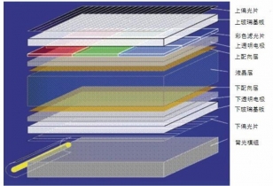 液晶面板主要由液晶組件和背光模組兩部分構(gòu)成,典型液晶顯示器件基本結(jié)構(gòu)如圖所示。液晶組件從結(jié)構(gòu)上說,屬于平板顯示器件,其基本結(jié)構(gòu)呈多層的平板形。不同類型的液晶組件其部分部件可能會有不同,但是所有液晶組件都可以認為是由兩片光刻有透明導(dǎo)電電極的基板,夾持一個液晶層,封裝成一個扁平盒,再在外表面貼裝上偏光片等構(gòu)成。