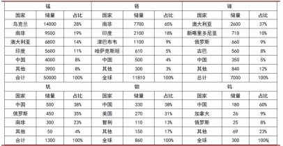 國內(nèi)錳、鉻、鎳等資源儲量貧乏,每年需大量進(jìn)口國外優(yōu)質(zhì)錳礦、鉻礦和鎳礦,國內(nèi)錳鐵、鉻鐵、鎳鐵生產(chǎn)企業(yè)只是獲得了少量加工費(fèi),在這些細(xì)分領(lǐng)域的資源約束是行業(yè)發(fā)展面臨的主要問題;而中國的釩、鉬、鎢、稀土等稀有金屬資源儲量較豐富,發(fā)展特種鐵合金產(chǎn)業(yè)具有先天優(yōu)勢。