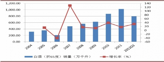 白酒(折65度)銷量及增長情況