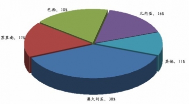 2011年全球鋁土礦產(chǎn)量為2.2億噸,產(chǎn)量同比上漲5.26%。澳大利亞鋁土礦處于全球首位,2011年產(chǎn)量高達(dá)6700萬(wàn)噸,占全球30.45%;中國(guó)是全球第二大鋁土礦生產(chǎn)國(guó),2011年中國(guó)鋁土礦產(chǎn)量為4600萬(wàn)噸,占全球總產(chǎn)量的20.91%;此外,2011年巴西鋁土礦產(chǎn)量為3100萬(wàn)噸,是全球第三大鋁土礦生產(chǎn)國(guó)。