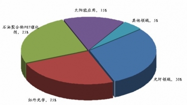 2011年全球鍺需求結(jié)構(gòu)為:光纖領域30%,紅外光學25%,石油聚合物PET催化劑25%,電子太陽能應用15%;其它領域(冶金、化療、磷工業(yè)等)5%。
