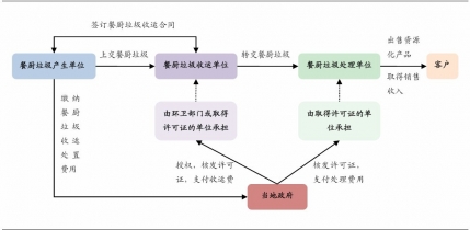 在中國餐廚垃圾收運(yùn)處置體系中,當(dāng)?shù)卣姓块T負(fù)責(zé)統(tǒng)一管理工作,核發(fā)餐廚垃圾清運(yùn)、處理許可證,或通過招標(biāo)確定收運(yùn)、處置單位。多數(shù)情況下,餐飲企業(yè)需要繳納收運(yùn)處理費(fèi),除此之外,地方財(cái)政也會(huì)撥付一定資金,兩部分資金共同來支付餐廚垃圾的收運(yùn)、處理費(fèi)用。對(duì)于收運(yùn)企業(yè),其收入僅為政府支付的收運(yùn)費(fèi)用。對(duì)于處理企業(yè),其收入由政府支付的處理費(fèi)用和銷售資源化產(chǎn)品的收入兩部分組成。