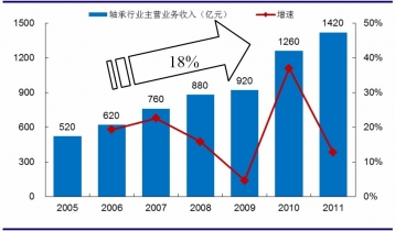 2005-2011年中國軸承工業(yè)主營業(yè)務(wù)收入及增速統(tǒng)計