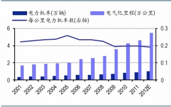 根據(jù)鐵路“十二五”發(fā)展規(guī)劃的遠(yuǎn)景目標(biāo),到2015年,全國(guó)鐵路營(yíng)業(yè)里程達(dá)12萬(wàn)公里左右,復(fù)線率和電化率分別達(dá)到50%和60%以上。截至2011年,全國(guó)鐵路營(yíng)業(yè)里程達(dá)到9.3萬(wàn)公里,同比增長(zhǎng)2.3%,電氣化里程4.6萬(wàn)公里,電化率49.4%,若完成十二五的規(guī)劃目標(biāo),意味著未來(lái)三年電氣化里程將達(dá)到2.7萬(wàn)公里,占2011年電氣化里程存量的58.7%。