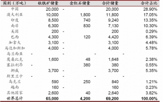根據(jù)2012年美國地質(zhì)調(diào)查局(USGS)公布的資料,全球鈦鐵礦儲量6.5億噸;金紅石儲量4200萬噸,二者合計儲量約6.92億噸,而我國的鈦資源儲備約兩億噸,占到全球總儲量的28.9%,鈦礦儲量位居世界第一。