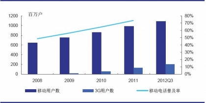 3G業(yè)務驅(qū)動我國移動用戶數(shù)持續(xù)增長。我國移動通信服務業(yè)發(fā)展迅速,不斷增長的需求帶動下游通訊運營商對移動基站設(shè)備的投資。截至2012年9月,我國移動電話用戶數(shù)達到10.8億戶,普及率超過70%。其中以數(shù)據(jù)業(yè)務為主的3G技術(shù)是主要驅(qū)動力,進入下半年以來,3G用戶數(shù)呈現(xiàn)加速增長的趨勢,10月份三大運營商新增3G用戶994萬,創(chuàng)歷史新高。