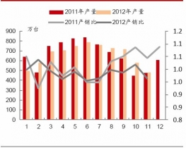 產(chǎn)量隨著銷量收縮,產(chǎn)銷比小幅度下滑。2012年11月份冰箱行業(yè)總產(chǎn)量為484.1萬臺,同比上升1.9%,環(huán)比10月份行業(yè)總產(chǎn)量減少95萬臺。行業(yè)產(chǎn)量增速繼續(xù)慢于出貨量增速,整體產(chǎn)銷情況良好。從產(chǎn)銷比看,11月行業(yè)產(chǎn)銷比下滑至0.96,相比10月下降0.6。對于12年全年我們依然維持之前相對樂觀的判斷,低基數(shù)效應(yīng)在10月份開始顯現(xiàn),行業(yè)出貨量預(yù)期持續(xù)回暖。