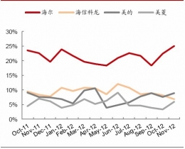 海爾市場份額再度擴大,美的市場份額超過海信。11月海爾冰箱出貨量市場份額穩(wěn)居第一,領(lǐng)先幅度再次擴大,11月份海爾出貨量市場份額為25.02%,比10月份提升2.58個百分點。市場份額重新回到第二,11月美的市場份額為8.92%%,較10月提升1.3個百分點,并且超過海信11月6.87%的市場份額。美菱市場份額大幅回升2.5個百分點,達到5.96%。