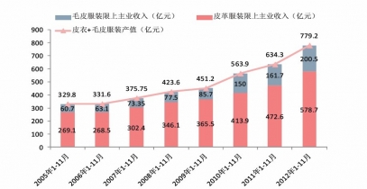 本文導(dǎo)讀:2012年毛皮/皮革服裝出口分別約32.1/134.1億人民幣,剔除出口后,毛皮和皮革服裝內(nèi)銷工業(yè)產(chǎn)值約680億元(限額以上:年收入達(dá)2000萬(wàn)元以上),其中皮革服裝同比增長(zhǎng)18.1%,毛皮20.9%。
