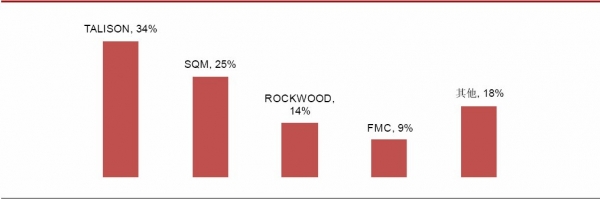 鋰行業(yè)有著自然壟斷的條件,一是優(yōu)質(zhì)鋰資源稀少且集中,多已被瓜分,二是提鋰技術(shù)難度高(主要是鹽湖),工藝流程復(fù)雜,這兩大壁壘使得行業(yè)的產(chǎn)能以及市場份額相對(duì)集中,前四大巨頭(鹽湖提鋰的SQM、FMC、ROCKWOOD以及礦山提鋰的泰利森)的市場份額占全球80%左右。