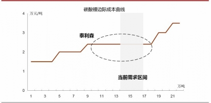未來供應(yīng)彈性主要來自礦山。根據(jù)我們測算的碳酸鋰行業(yè)邊際成本曲線,現(xiàn)階段實(shí)際產(chǎn)能充足(主要由于泰利森39萬噸鋰輝石產(chǎn)能已于2012年投放)。泰利森產(chǎn)能釋放進(jìn)度是決定碳酸鋰供需未來格局的最重要因素。然而在行業(yè)寡頭格局不變的情況下,行業(yè)巨頭對(duì)實(shí)際產(chǎn)量釋放進(jìn)度控制能力較強(qiáng),料將依照需求情況而有序釋放,以實(shí)現(xiàn)利潤最大化。因此,我們認(rèn)為全球供給或?qū)⒀永m(xù)人為偏緊格局。