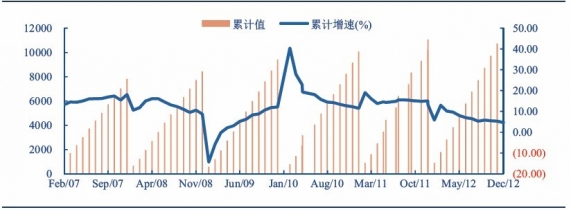 2006-2012年造紙行業(yè)固定資產(chǎn)投資增速顯著下滑(單位:10億元)