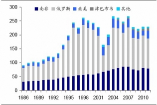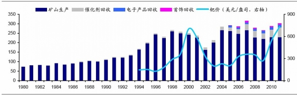 鈀金的礦山供給主要來自于俄羅斯、南非與北美(主要是加拿大)。根據(jù)2011年數(shù)據(jù),俄羅斯、南非與加拿大供給的占比分別達到了47.3%、34.8%與12.2%。從近年來各地區(qū)礦山的供給情況來看,俄羅斯與南非的礦產(chǎn)量走平或下降,而北美礦山供給的波動性較大,總體而言近年來礦山的供給相對穩(wěn)定。