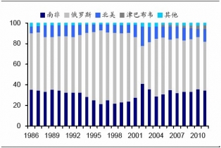 1986-2011年各國鈀開采占比,%