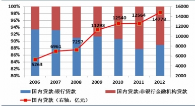 本文導(dǎo)讀:國(guó)內(nèi)貸款分為銀行貸款和非銀行金融機(jī)構(gòu)貸款,隨著銀行收緊房地產(chǎn)信貸與信托、財(cái)務(wù)公司、金融租賃公司等非銀行金融機(jī)構(gòu)的發(fā)展,銀行貸款占國(guó)內(nèi)貸款的占比不斷下行,但仍高于88%,而非銀行金融機(jī)構(gòu)貸款占比雖一路提升但規(guī)模較小,2012年僅1638億,占比11%。預(yù)計(jì)為解決中小企業(yè)融資難問(wèn)題,非銀行金融機(jī)構(gòu)對(duì)實(shí)體經(jīng)濟(jì)的支撐力度將進(jìn)一步加大。