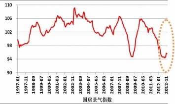 在中央堅(jiān)持房地產(chǎn)調(diào)控政策不動搖的影響下,2012年以來“國房景氣指數(shù)”持續(xù)處于下行通道。12月份房地產(chǎn)成交量延續(xù)11月份的反彈趨勢,環(huán)比上升1.3%,全年增加30.2%,帶動“國房景氣指數(shù)”持續(xù)反彈。據(jù)國家統(tǒng)計(jì)局?jǐn)?shù)據(jù),12月份“國房景氣指數(shù)”為95.59,與上年同期相比回落3.3個(gè)百分點(diǎn),跟上月基本持平。該指數(shù)連續(xù)二月回暖,預(yù)示著房地產(chǎn)市場正逐漸走出底部,預(yù)計(jì)這種升溫還將持續(xù)。