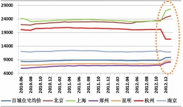 2012年12月全國百城(新建)住宅平均價(jià)格為9715元/平方米,環(huán)比上漲0.23%,為自2012年6月比跌后連續(xù)7個(gè)月環(huán)比上漲;同比方而結(jié)束了連續(xù)8個(gè)月的下跌,微幅上漲0.03%。同時(shí),從北京、上海等一線城市(新建)住宅平均價(jià)格來看,其漲幅遠(yuǎn)高于百城平均水平,表明2012年的市場回暖和價(jià)格上漲主要集中在少數(shù)熱點(diǎn)城市,不同城市的分化較為明顯。從圖可明顯看出,相對北京、上海、鄭州、昆明等一二線城市房價(jià)上揚(yáng),杭州、南京的房價(jià)反而出現(xiàn)階段性下跌。