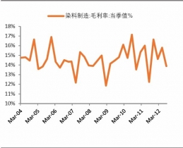 2012年1~9月,染料行業(yè)累計實現(xiàn)營業(yè)收入與利潤總額分別較2011年同期增長4.98%與1.74%,2004~2012年染料行業(yè)毛利率位于12%~18%之間,平均毛利率水平為15%。