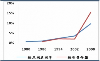 隨著生活水平的提高,糖尿病在我國的患病率已經(jīng)由2000年的不足4%增加到近10%的水平,估計(jì)患病人數(shù)已達(dá)到9200萬,此外我國還有數(shù)億糖耐量受損患者(血糖指標(biāo)達(dá)不到糖尿病診斷標(biāo)準(zhǔn),但高于正常值的群體,有進(jìn)展為糖尿病的風(fēng)險(xiǎn)),龐大的患病群體和高危人群使得糖尿病用藥市場(chǎng)具有極大的增長(zhǎng)潛力。