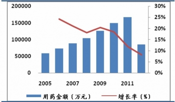 龐大的患病人群催生了巨大的市場(chǎng),根據(jù)樣本醫(yī)院統(tǒng)計(jì)數(shù)據(jù)顯示,2011年樣本醫(yī)院口服降糖藥的用藥金額約16.6億元,預(yù)計(jì)終端市場(chǎng)規(guī)模超過百億,受老品種用藥基數(shù)大且降價(jià)壓力較大,新品種仍處在市場(chǎng)開拓期的影響,近年來降糖藥市場(chǎng)增速并不快,但長(zhǎng)期來看,受益于龐大的人口基數(shù)和高發(fā)的患病率,降糖藥市場(chǎng)遠(yuǎn)未達(dá)到飽和,仍有廣闊的成長(zhǎng)空間。