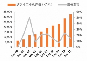 2002-2011年中國紡織工業(yè)總產(chǎn)值及增長率