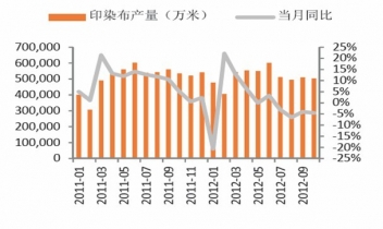 2011-2012年中國印染布月度產(chǎn)量及同比增速