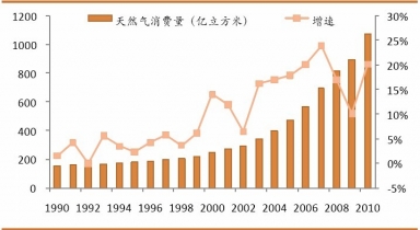 隨著西氣東輸二線的建成、三線的開工,天然氣的消費量會大幅增長,未來天然氣在能源消費占比中的份額會繼續(xù)提升。中國國家能源局副局長吳吟表示:“十二五”期間將考慮發(fā)揮價格杠桿調(diào)節(jié)作用,鼓勵以氣代油,促進天然氣產(chǎn)業(yè)發(fā)展,將天然氣占中國能源消費結(jié)構(gòu)中的比重提高至8%?梢姡磥砦覈烊粴夤┬柙鲩L空間巨大,行業(yè)整體迎來了快速發(fā)展的機遇期。2010年,我國的天然氣消費量為1075.7億立方米,預(yù)計到2015年我國天然氣消費量將達到2600億立方米。十二五期間,天然氣的消費年均增速有望達到20%。