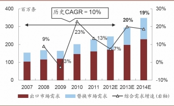 加權(quán)計(jì)算替換需求井噴及特保案取消的積極影響,我們預(yù)計(jì)13-14年國(guó)產(chǎn)品牌半鋼胎需求增速將分別達(dá)到20%和19%,兩倍于過去五年的國(guó)內(nèi)需求復(fù)合增速(10%);雙輪驅(qū)動(dòng)下,未來兩年內(nèi)國(guó)產(chǎn)半鋼胎行業(yè)景氣度預(yù)期將顯著提升。