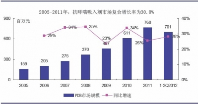 本文導(dǎo)讀:2005-2011年,樣本醫(yī)院抗哮喘吸入劑市場(chǎng)從1.59億增長(zhǎng)到7.68億,復(fù)合增長(zhǎng)率30.0%,2012年前三季度實(shí)現(xiàn)收入7.01億,增長(zhǎng)28%。國(guó)內(nèi)抗哮喘吸入劑市場(chǎng)外資高度壟斷。