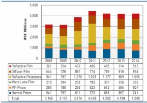 2008-2014年全球LCD背光光學(xué)膜市場空間測算