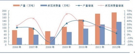 2006至2012年鈦白粉產(chǎn)銷量變化