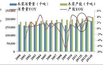 本文導(dǎo)讀:據(jù)預(yù)測,2012 年全球木漿消費(fèi)量增速0.1%,產(chǎn)能增速2%,供給YOY>需求YOY,產(chǎn)能利用率由90%以上下降至86%,供給增量而需求缺乏支撐造成漿價(jià)大幅走低。