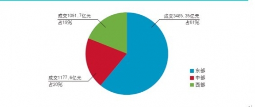2012年,中部地區(qū)成交額與2011年基本持平;其中,河南、湖北呈上升態(tài)勢,分別增長42.85%和4.26%,而其它省份則呈現(xiàn)小幅下滑。