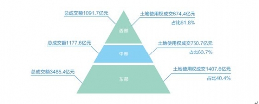 2012年中國(guó)東、中、西部土地使用權(quán)拍賣占比