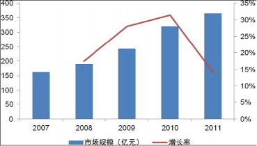 2007年-2011年我國(guó)低分子肝素市場(chǎng)規(guī)模及增長(zhǎng)率