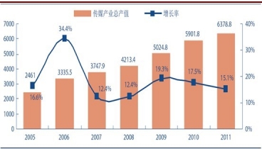 2011年傳媒文化產(chǎn)業(yè)產(chǎn)值為6379億元,同比增長(zhǎng)15.1%,增速持續(xù)上升,保持良好增長(zhǎng)態(tài)勢(shì)。如果包括印刷業(yè)等相關(guān)產(chǎn)業(yè),大文化產(chǎn)業(yè)產(chǎn)值達(dá)1.28萬(wàn)億,同比增長(zhǎng)16%。從整體趨勢(shì)來(lái)看,傳媒產(chǎn)業(yè)與國(guó)民生產(chǎn)總值增加值的變化有明顯的相關(guān)性,傳媒產(chǎn)業(yè)的繁榮建立在國(guó)民經(jīng)濟(jì)發(fā)展的基礎(chǔ)上。