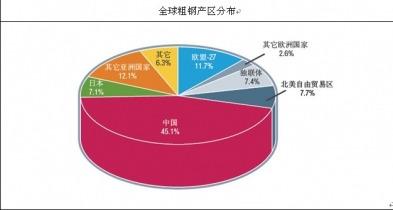 中國是全球最大的粗鋼產(chǎn)區(qū),在2011年全球15.18億噸產(chǎn)量中,中國占比為45.1%,日本產(chǎn)量占比為7.1%;歐盟產(chǎn)量占全球總產(chǎn)量的11.7%。