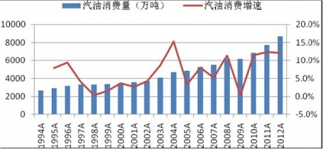 1994-2012年中國(guó)成品油消費(fèi)量增長(zhǎng)趨勢(shì)