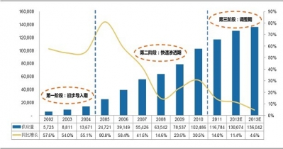 初步導(dǎo)入期(2002-2004年):由于初期供給量較低,所以這一階段的復(fù)合增長(zhǎng)率較高,約63%;