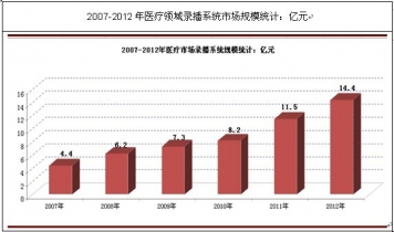 據(jù)了解,2011年我國醫(yī)療領域錄播系統(tǒng)市場規(guī)模為11.5億元,較2010年增長40%。2012年該領域錄播系統(tǒng)市場規(guī)模為14.4%。隨著醫(yī)療領域錄播系統(tǒng)滲透力度的加深,行業(yè)將延續(xù)高速發(fā)展態(tài)勢。